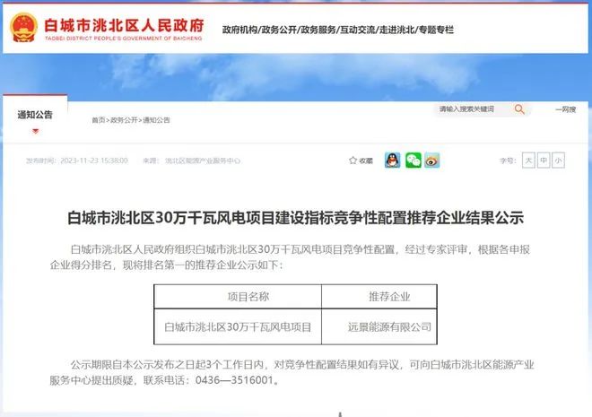 吉林白城50万千瓦风电指标竞配结果公布,远景、上海电气中选!